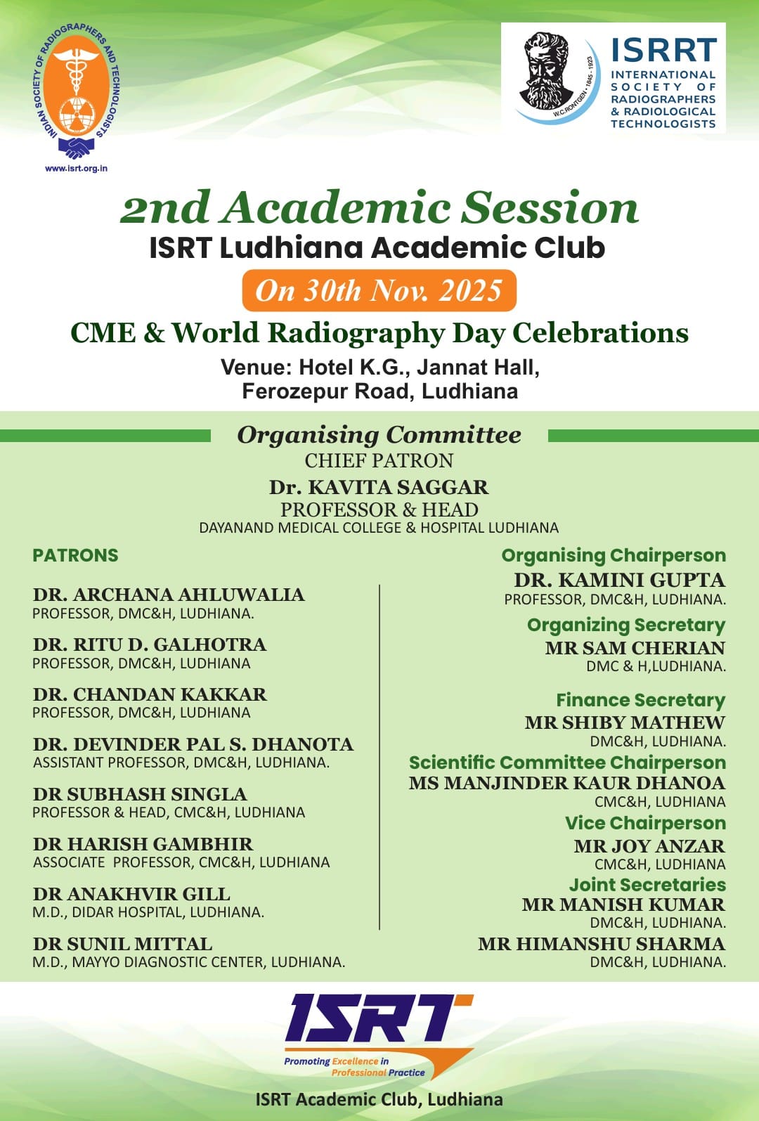 The ISRT Ludhiana Academic Club proudly presents its 2nd Academic Session and World Radiography Day Celebrations on 30th November 2025 at Hotel K.G., Jannat Hall, Ferozepur Road, Ludhiana.