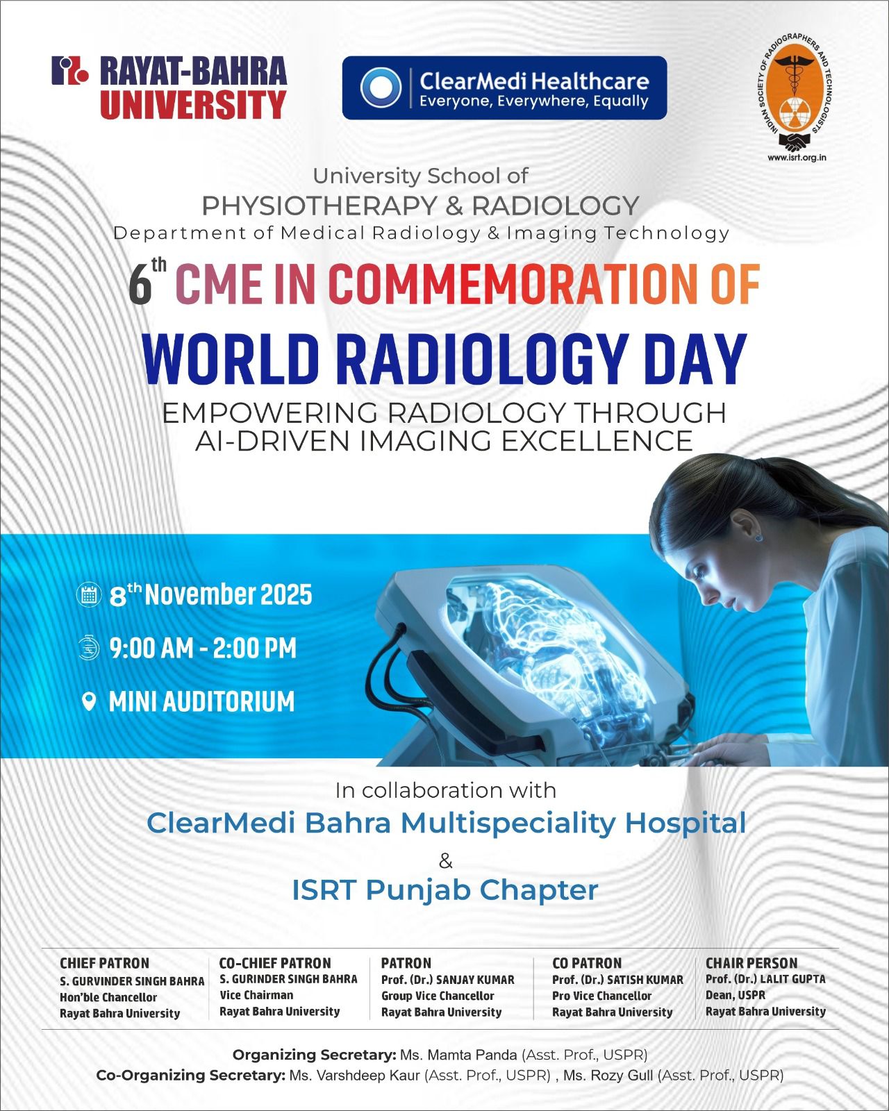 The University School of Physiotherapy & Radiology, Rayat-Bahra University, in collaboration with ClearMedi Bahra Multispeciality Hospital and the ISRT Punjab Chapter, proudly hosted the 6th CME in Commemoration of World Radiology Day 2025.