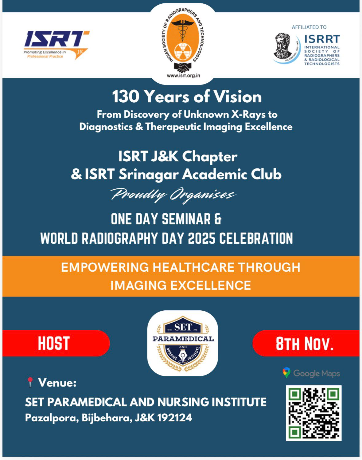 This is to inform that under the banner of ISRT, our J&K Chapter is organizing a One-Day Academic & Scientific Seminar on World Radiography Day 8th November 2025 at SET PARAMEDICAL AND NURSING INSTITUTE
