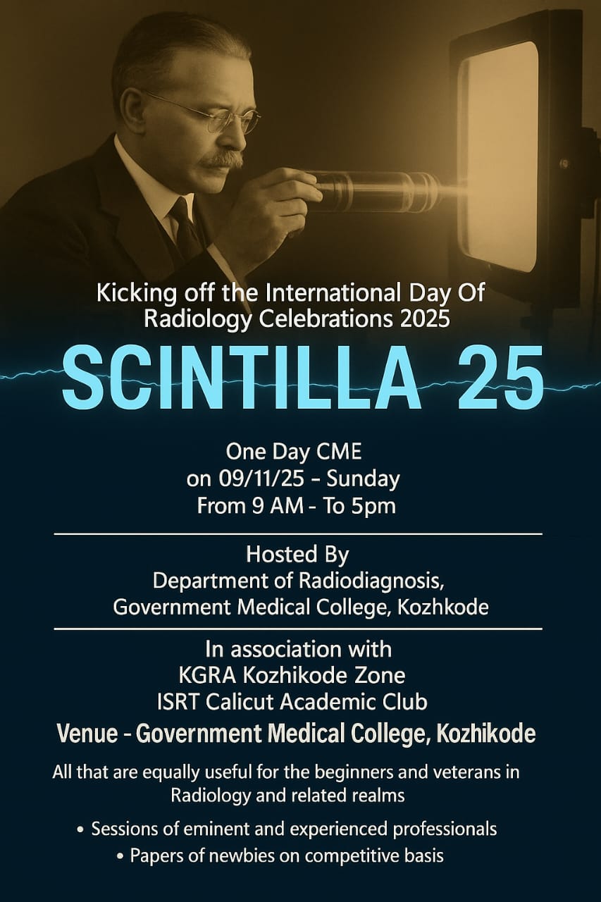 The Department of Radiodiagnosis, Government Medical College, Kozhikode, in association with KGRA Kozhikode Zone and ISRT Calicut Academic Club, proudly presents SCINTILLA 25, a one-day CME marking the beginning of the International Day of Radiology Celebrations 2025.