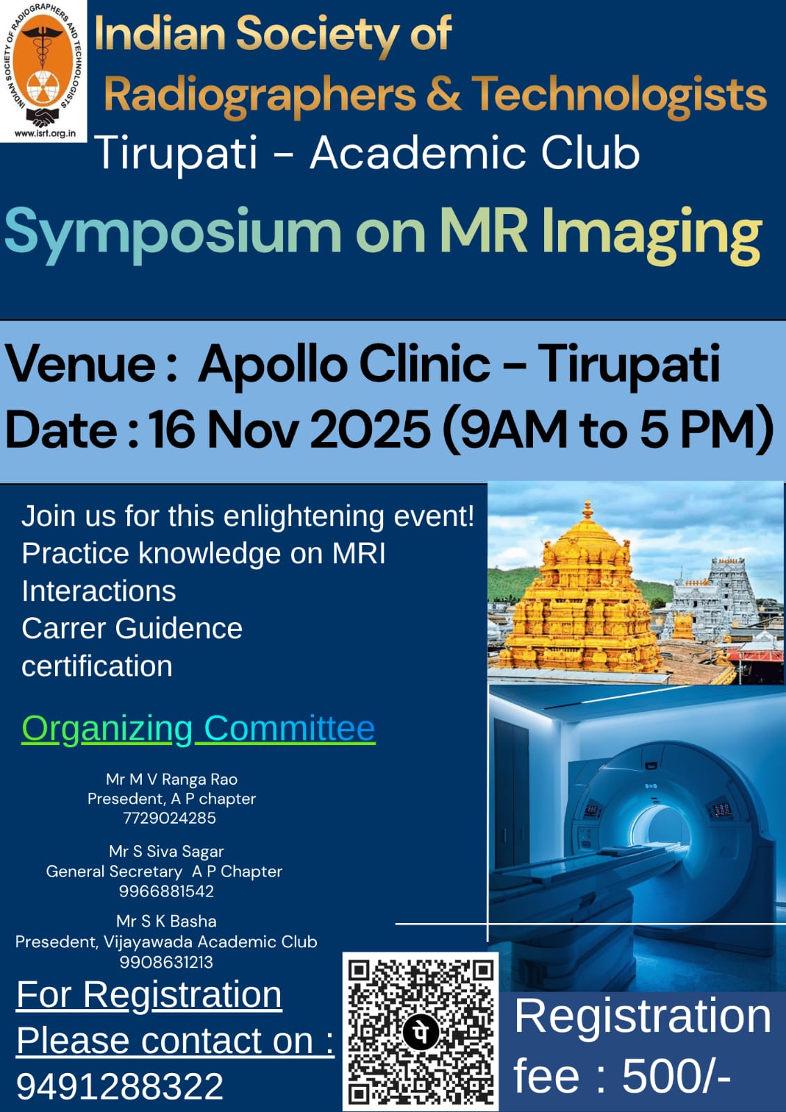 The ISRT Tirupati Academic Club is set to organize a one-day Symposium on MR Imaging (A to Z) on 16th November 2025 at Apollo Clinic, Tirupati.