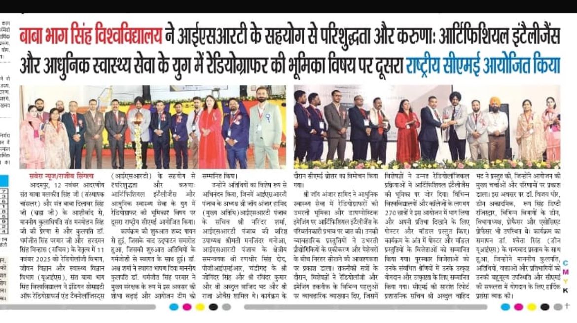 Sant Baba Bhag Singh University organized the 2nd National CME in collaboration with ISRT on the topic: Precision and Compassion: The Role of Radiographers in the Age of Artificial Intelligence and Modern With the blessings of the revered Sant Baba Malkit Singh Ji (Founder Chancellor) and Sant Baba Dilawar Singh Ji under the inspiration of the Honorable Chancellor Sant Manmohan Singh Ji and the leadership of Vice Chancellor Dr. Dharamjit Singh Parmar Ji and Hardaman Singh Minhas (Secretary), on November 11, 2025, the Discipline of Radiology, Department of Life Sciences and Allied Health Sciences (UIS), Sant Baba Bhag Singh University, in collaboration with the Indian Society of Radiographers and Technologists (ISRT), organized the 2nd National CME on the topic: Precision and Compassion: The Role of Radiographers in the Age of Artificial Intelligence and Modern Healthcare. The program began with a holly recitation, followed by the inauguration ceremony, which was started with a warm welcome to the guests by Dr. Aksh Sharma who delivered the welcome address. Honorable Vice Chancellor Dr. Dharamjit Singh Parmar graced the occasion as the Chief Patron and honored the organizing team. He specifically welcomed the guests, including Mr. Joy Anzar Hamid, President of ISRT Punjab (Chief Guest), Mr. Narinder Sharma, Secretary of ISRT Punjab, Mrs. Manjinder Danoha , Senior Vice President of ISRT Punjab, Mr. Randhir Singh Doad Regional Coordinator of ISRT Punjab, Mr. Joginder Singh and Mr. Ravinder Kumar from PGIMER, Chandigarh, and Mr. Abdul Wajid Bhatt and Mr. Raja Owais. During the program, the CME brochure was released.