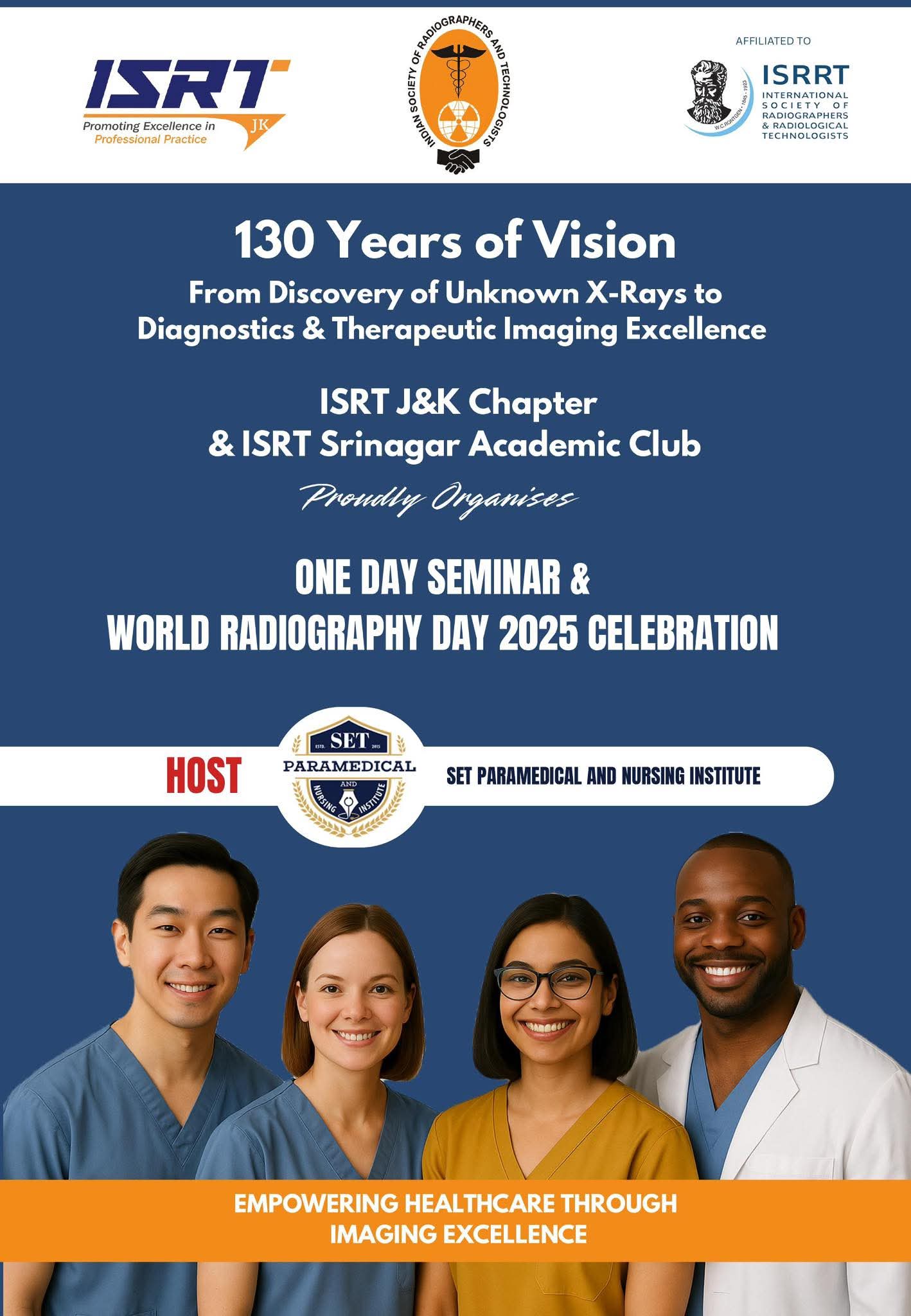 Celebrating 130 years since the discovery of X-rays, the ISRT J&K Chapter and ISRT Srinagar Academic Club, in association with SET Paramedical and Nursing Institute, proudly present a one-day seminar commemorating World Radiography Day 2025.